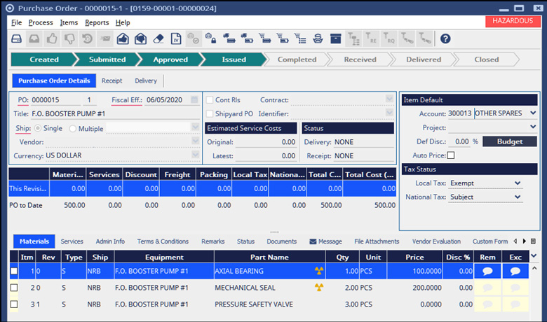 - Identify spare parts that are hazardous, including hazard type and quantity of hazardous material per part