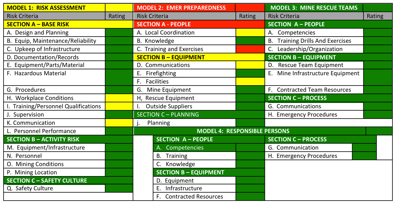 In a 2012 gap analysis, the U.S. Department of Labor's Mine Safety and Health Administration (MSHA) determined that there were no efforts to develop tools for the mining industry to use to assess their risk and preparedness. Assessment models for mine management teams, mine rescue teams and responsible persons did not exist at that time. A previous Risk Assessment model for the mining industry, which used to be funded by the National Institute for Occupational Safety and Health (NIOSH), was found to be too cumbersome to apply. MSHA sought a simpler model that would be readily available for the mining industry to address safety and emergency preparedness.